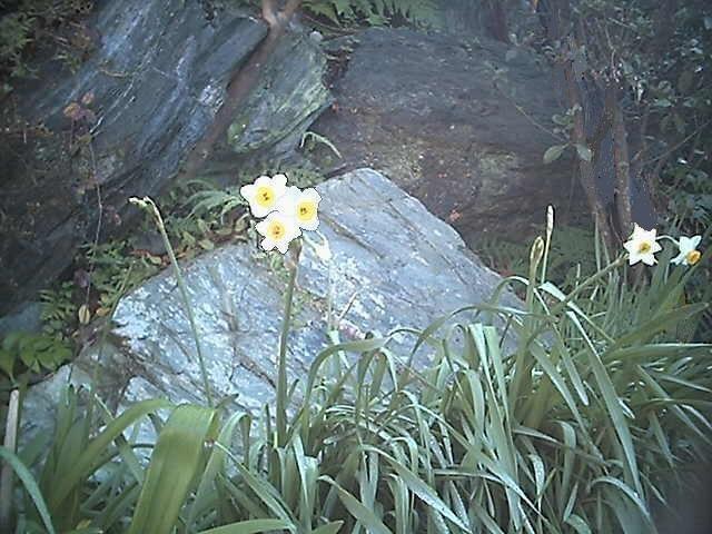 青石の持つ趣も一つのテーマとして撮影しました。 青石そのものは何処にあってもその色合いから庭全体に落ち着き、静けさの雰囲気を与えます。それに水仙の趣を加えると更にしっとり感が出てきます。 石に焦点を合わしているので水仙はピントが甘く成り際立ちません。 蕾と葉でも良いのです。それで撮影条件を日差しの強くない時を選び水仙の咲き方が少ない時を選びました。 多いと水仙の強い趣が全面に出てしまうので咲き始めの時期を選びました。
