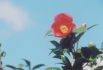 葉の濃い緑を添え物に何ともいえない空の色と真紅の赤は人を魅了します。