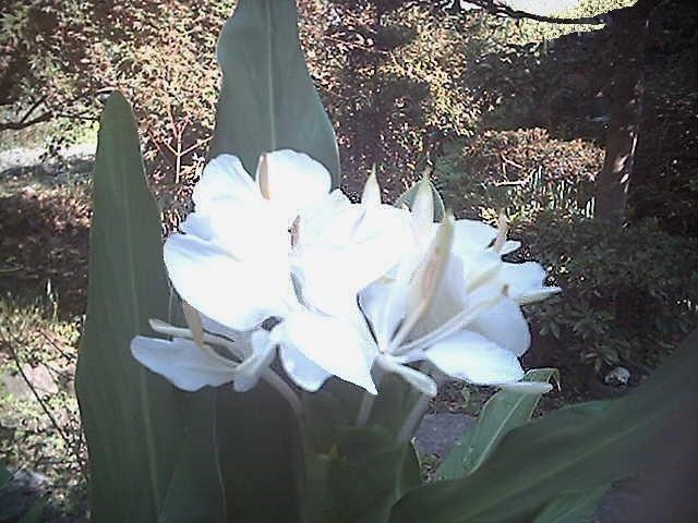 ■解説 此花は「ジンジャー」と云うらしいのですが、実に香りの強い花です。 そして、その香りはかなり広範囲に拡がる特徴を持っています。 この香りはよく嗅ぐと「くちなしの花」の香りに似ています。 真っ白な花で長く咲き続けます。 葉はカンナの葉に大変似ていますが、専門で無いので判りませんがカンナ科ではとも思います。一つの茎軸からは5つか6つの花が一つに成って咲き誇ります。