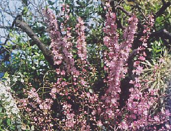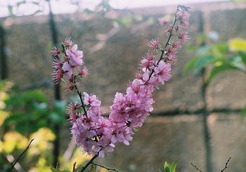 此花は小さい事と群れて咲くので、その花びらの形を一つ一つ認識する事は印象的にはあまり少なく、全体として薄紫の長い花の柳の群れと云う趣があります。 遠くから観ると紫の花棒が直立していると云う感じです。 元木も太くなりませんので、春に変わった紫の菜花が咲き乱れているという感じです。 全体として大きくなるとこの様な枝が花火を打ち上げたように丸い木姿に成ります。