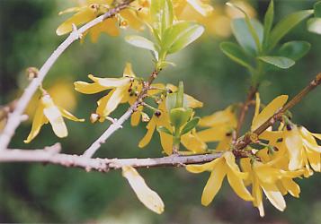 深みの在る黄色い花で15ミリ程度の花が咲きます。 此花は春の日差しに敏感に反応する花です。 木姿は細い枝を放射状に伸び其処に花目をつけます。花目と同時に薄黄緑の若葉を枝先につけます。毎年30センチ程度伸びて放って置くと大変な木に成ります。そこでいつもこの伸びた枝程度を咲き終わると直ぐに剪定します。そうする事で次ぎの歳には多くの花目をつける事ができるのです。若葉と花を同時に楽しめる花木に成ります。 花色は勢いのある黄色ですが、その木の太さは柳の木程度で頼りない木姿です、 この頼りない木姿に咲いた花の趣は花同士が群生して助けあって咲いていると言ういじらしい感じがします。落花するときもいっせいに散る様です。 何か人間のこの世での生きる様を見せ付けられているこの花の様な感傷を持ちます。