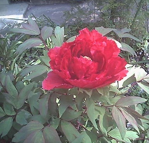 どんな春の日差しにも負けない花でフェリャーや色理論など無関係なほど自分の方から逃げていく様な主張です。 春の日差しを右から当てて斜め上から撮影します。 花だけではいやらしさが出ますので牡丹の葉を左に持ってきます。 後ろには強引に犬走りを入れました。何か逆らいたい気持ちでこれでも牡丹の主張は落ちないだろうと。 実は路はフェリャーが働きやすい被写体ですので働かないだろうと思ってのことでもあるのです。如何にこの花の赤が強いかが判るのですが働いていません。 実は、葉を含む牡丹の花は写真姓を観る写真技術の被写体の確認物なのです。