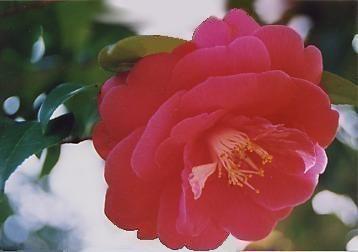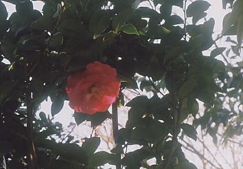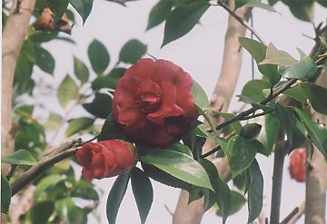 ■解説 この花は椿図鑑には載っていない珍しい椿です。 緋縮緬椿の赤椿に似ていますが、その改造型ではと見ています。 丸みのある花びらの形と葉の形が違います。 花の大きさも一回り大きい形をしています。 白の中型の緋縮緬椿と何か(藪椿系)の掛け合わせでしょう。 抱え咲きの大椿です。自慢の椿ですが、大椿(大王椿)と呼称しています。 花の大きさは何と15センチ以上もあります。 過去には20センチ弱のものを見た事があり、その時はこの木は一輪しか咲きませんでした。 その花の重みで下向きに咲きます。そして、その木には数多く花は咲かずに四五輪づつ咲き続けます。花の大きさの割りには木の枝は細枝です。放物線を描く様に柳のようにしなります。 余り日の当るところは好みません。どの道重いので下に向いていますので春の日差しはあたりません。花にエネルギーが行く為に乾燥に弱いのではと思います。 花の落ちる様は真に”どさー”です。落ちる趣は豪快といえばそうですが、趣は余りありません。しかし、咲いているときは隣の椿を圧倒します。 ”どけーどけー”と叫んでいる「花の大王」という趣です。 しかし、花の色はやや赤に紫が入ったもので落ち着きと静けさを感じます。