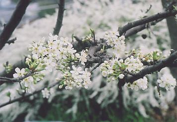 ■解説 すももの花です。 この花は15度以上に成ると真っ白な小さい花を着けます。 花は香りが少ないせいか小鳥はこの花にあまり寄って着ません。 この時、椿など密を豊富に出す香りの強い花々が多く、悲しきかな競争相手があまたです。ですから、後は椿などには来ず他のどんな花にも飛んでくる日本野生ミツバチのお世話になるしか有りません。