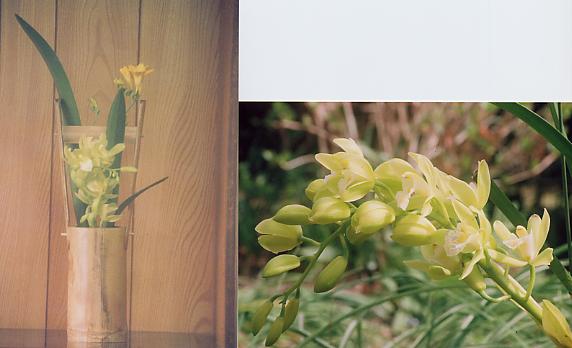 私が持つこの花の持つイメージが薄黄色が良く似合う花ではと思うのですが。 そこで、花だけをクローズして、葉は西洋の剣の形をしていますので印象が和風ではない気がします。植木鉢は余計な印象を花に与えますので外します。 写真にすると、この葉の形と長さと濃緑色の色を引き出すには花の画面を小さくする必要が出てきます。 この蘭の葉の数と巾は大きな面積をもっていませんので、そこで花だけを取り込み花だけの緑かかた薄黄色を出そうと試みました。 つまり、日本的趣としてもたんぽぽや菜の花の様に春の花を強調したいのです。 でも、この花は、先入観かもしれませんが、洋蘭で日本的趣が感じません。 綺麗さ、花の形、花弁の形、色合い、趣、葉と花の兼ね合いなど。咲き方、垂れ下がり方、全て”外国美人”という印象を持ちます。”西洋人に和服”ですね。 同じ蘭でも何故か日本蘭の様に床の間に合う花ではない感じがするのです。
