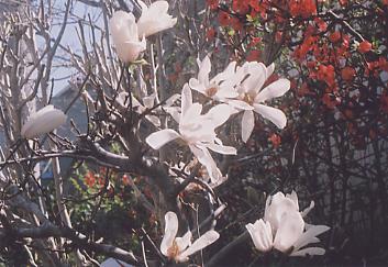 白木蓮と赤のボケの花が華やかさを競う様に咲き乱れています。
