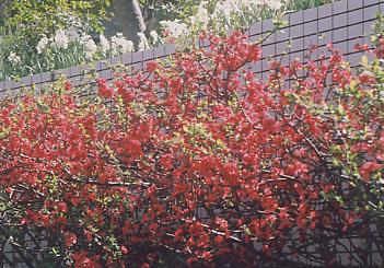 華やかですが、私には”春の山懐にある春の小川で遊んだ小さき頃の懐かしい思い出”が蘇ります。その思い出を一つにすればこの真紅の趣を持っています。 春のうららかな日差しがこの赤を円やかな趣を奏でています。 塀の上には水仙が観えていますが、その水仙の強い香りが引き寄せて、ボケの花も香りは有りませんが何か周囲に香りが漂わせている感じします。