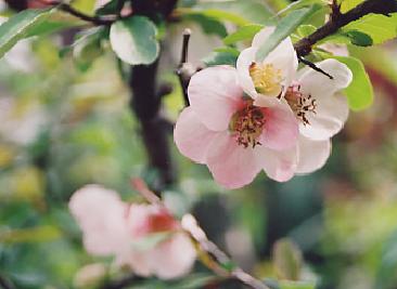 この「ぼけ」の花は赤の花の持つ主張と異なります。 実に、男性の私には、たおやかでやさしく汚れのない母の純愛を感じます。 このぼけの木の花には色藍があり、白、ピンク、斑入りの花が咲き乱れます。