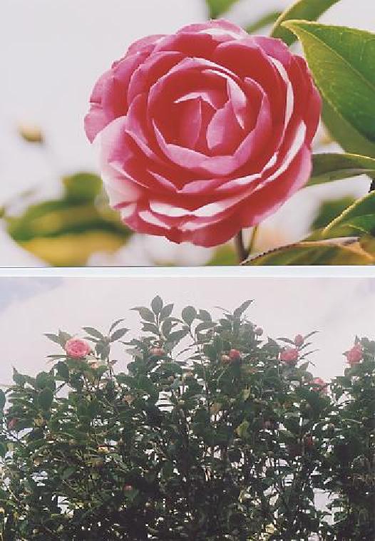 そこで咲く春の「花の女王」の椿、”どーです 春だから私を見なさい”と云われている様で、つい観てしまいます。 この様に作られた椿は藪椿系のように木勢は強くなく、これだけに大きくなるには百年以上は当に経っています。 さすが、最近は、温暖化や樹齢で花の小さくなり花目も少なくなってきました。 樹齢では熟年になったのでしょうか。しかし、木の大きさが持つ落ち着きは増しています。 中ほどには、ピンク、中央上には白、左上には赤斑入り大目、右下には赤斑入り小目、右中央白の斑入り、右上には蕾の白が観えています。ほぼ蕾の時に色判別が出来ます。 木が大きいので全体像が出ませんが、威風堂々です。